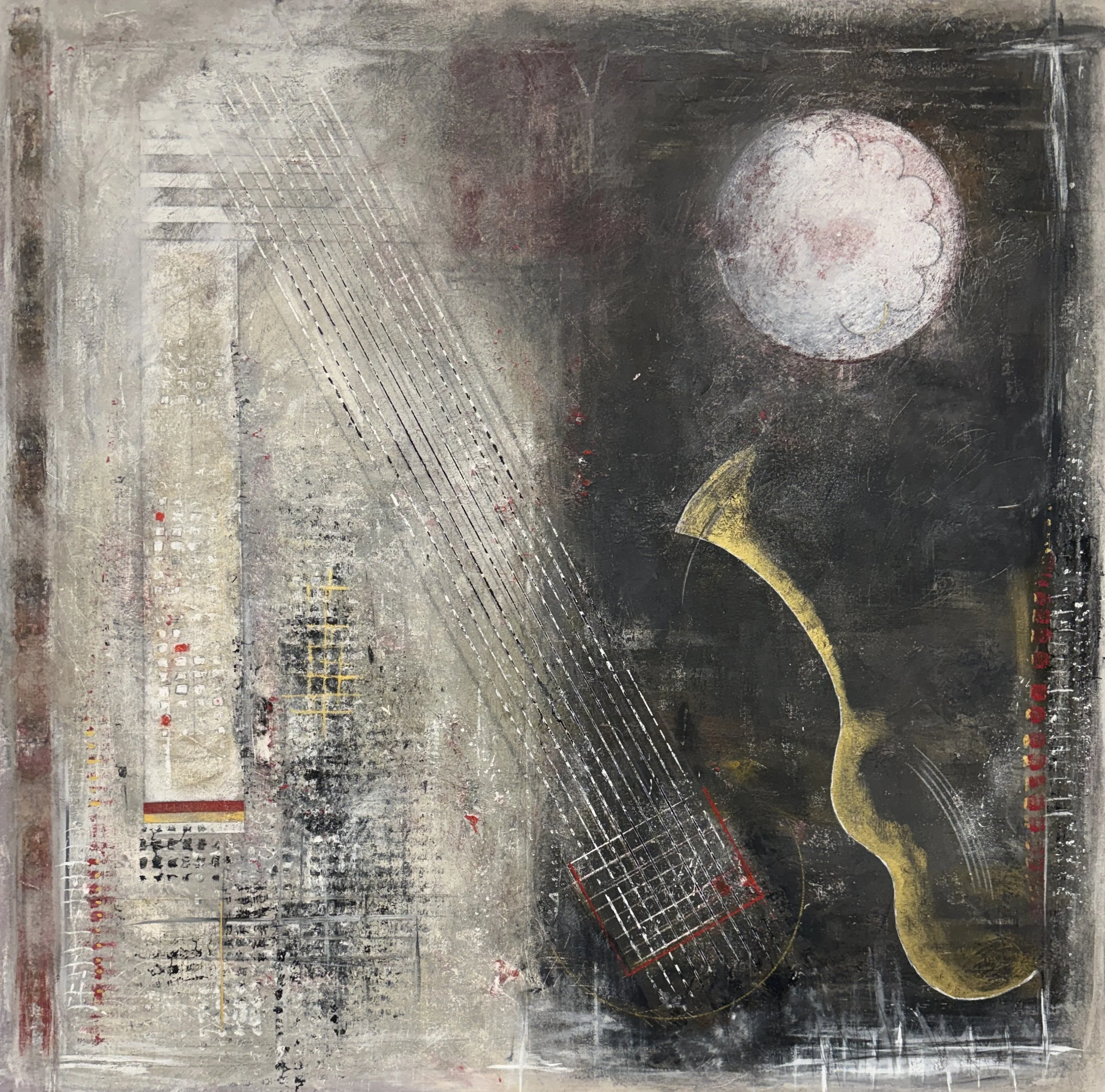 This painting draws on both architectural memory and symbolic form. At its centre, I shaped a pale vessel that floats in shallow relief β abstracted, undulant, part-object, part-apparition. Above it, a round disc hovers like a moon, watched over by a cloud-like form that shifts between sky and spirit.